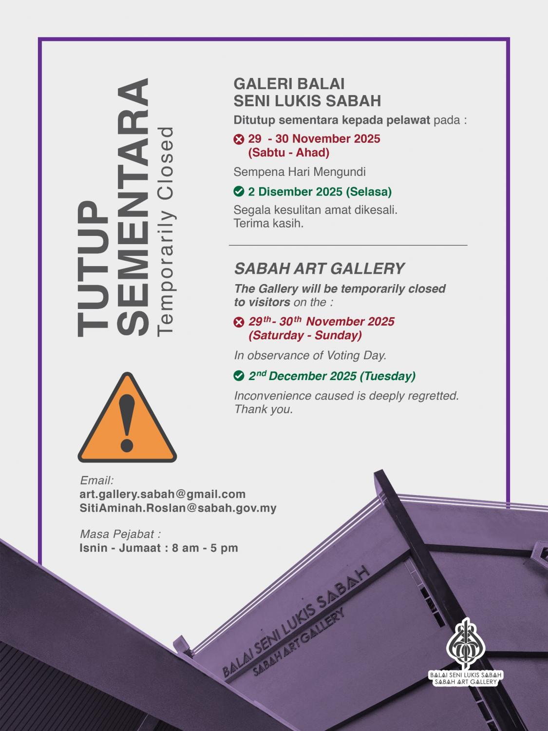 Talian telefon pejabat Balai Seni Lukis Sabah mengalami gangguan teknikal dan tidak berfungsi pada masa ini. Sila hubungi kami melalui e-mel: