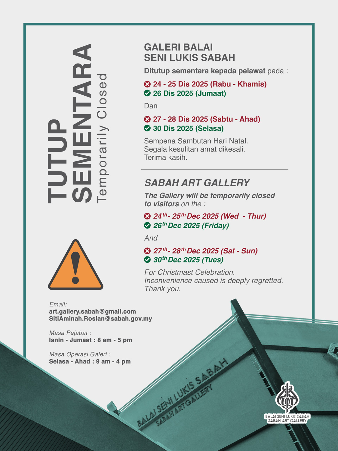 Talian telefon pejabat Balai Seni Lukis Sabah mengalami gangguan teknikal dan tidak berfungsi pada masa ini. Sila hubungi kami melalui e-mel: